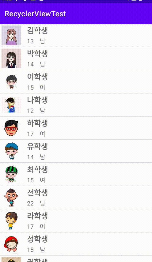 class RecyclerAdapter(val context: Context, val students: List<Students>) : RecyclerView.Adapter<RecyclerAdapter.Holder>() { inner class Holder(itemView: View?) : RecyclerView.ViewHolder(itemView!!) { val photo = itemView?.findViewById<ImageView>(R.id.image) val name = itemView?.findViewById<TextView>(R.id.name) val age = itemView?.findViewById<TextView>(R.id.age) val gender = itemView?.findViewById<TextView>(R.id.gender) fun bind (students: Students, context: Context) { if (students.photo != "") { val resourceId = context.resources.getIdentifier(students.photo, "drawable", context.packageName) photo?.setImageResource(resourceId) } else { photo?.setImageResource(R.mipmap.ic_launcher) } name?.text = students.name age?.text = students.age.toString() gender?.text = students.gender Log.d("RecyclerAdapter", "bind") } } override fun onCreateViewHolder(parent: ViewGroup, viewType: Int): Holder { val view = LayoutInflater.from(context).inflate(R.layout.recycler_view_item, parent, false) Log.d("RecyclerAdapter", "onCreateViewHolder") return Holder(view) } override fun onBindViewHolder(holder: Holder, position: Int) { Log.d("RecyclerAdapter", "onBindViewHolder") holder.bind(students[position], context) } override fun getItemCount() = students.size }Holder에서 한번 찾고 나서 bind를 통해 뷰에 아이템 정보를 넣어줄 뿐 매번 뷰를 찾아오지는 않는다.