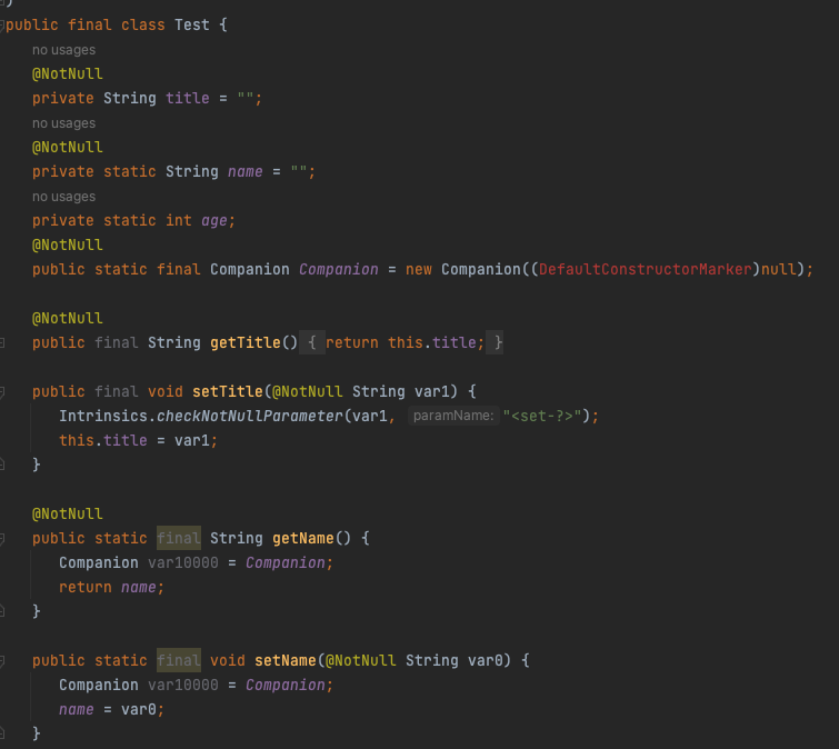 - 실제로 @JvmStatic어노테이션이 붙은 변수는 Test class 안에 getter, setter가 생성