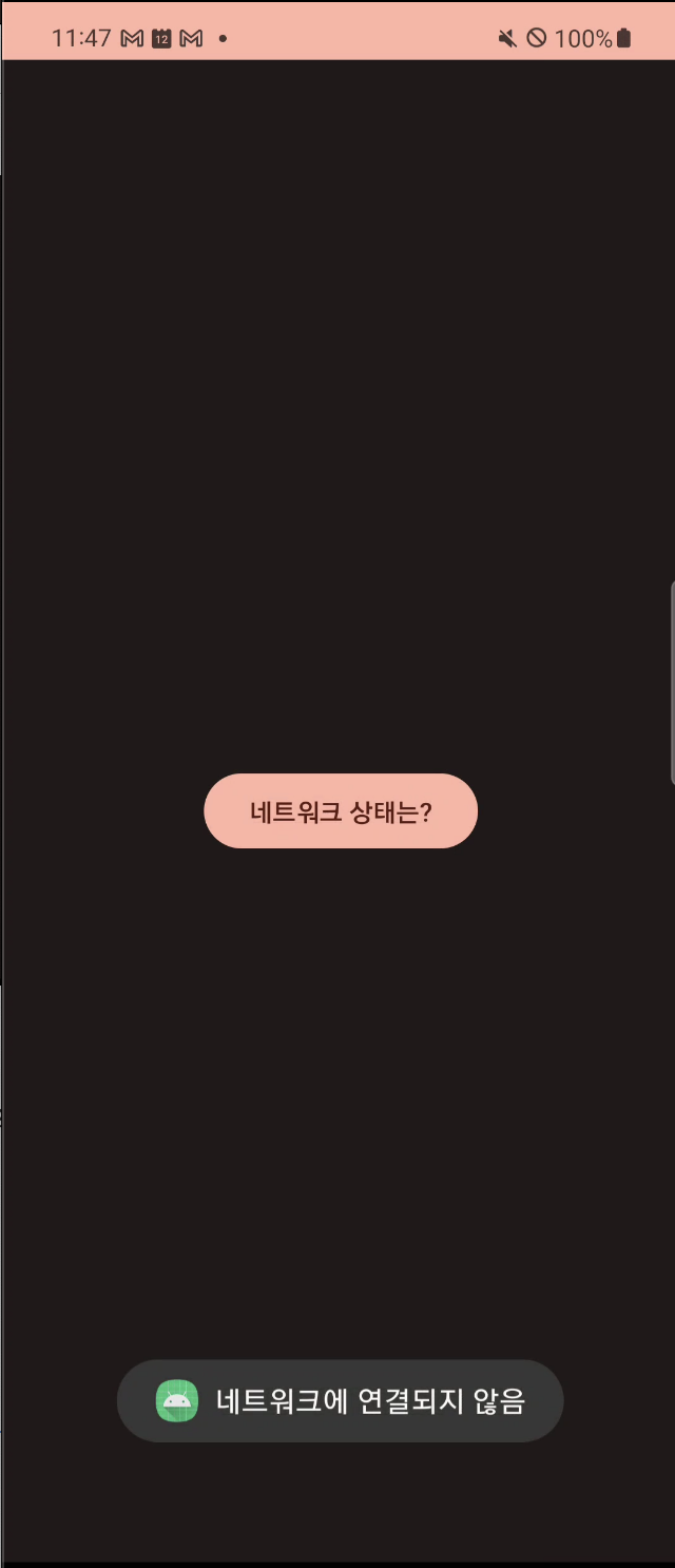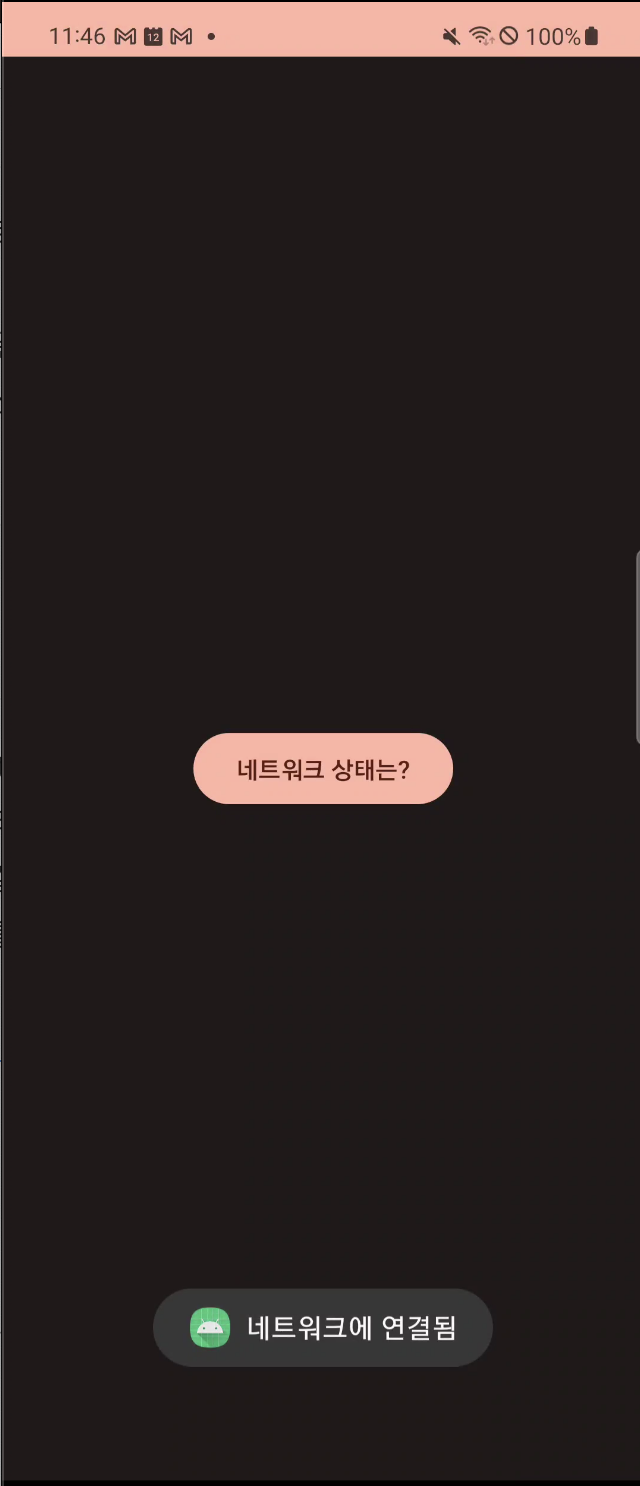 connectivityManager.registerDefaultNetworkCallback(object : ConnectivityManager.NetworkCallback() { override fun onAvailable(network : Network) { Log.e(TAG, "The default network is now: $network") Toast.makeText(this@MainActivity, "네트워크에 연결됨", Toast.LENGTH_SHORT).show() } override fun onLost(network : Network) { Log.e(TAG, "The application no longer has a default network. The last default network was $network" ) Toast.makeText(this@MainActivity, "네트워크 없음", Toast.LENGTH_SHORT).show() } override fun onCapabilitiesChanged(network : Network, networkCapabilities : NetworkCapabilities) { Log.e(TAG, "The default network changed capabilities: $networkCapabilities") } override fun onLinkPropertiesChanged(network : Network, linkProperties : LinkProperties) { Log.e(TAG, "The default network changed link properties: $linkProperties") } })위 코드로 콜백을 걸어주면 네트워크가 연결될 때, 끊길 때 콜백이 오고 그때 하고 싶은 행위를 넣어주면 된다.